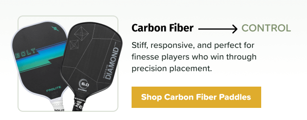Here's where carbon fiber really matters: control. When the ball hits a carbon fiber face, you get this softer, more responsive touch that makes it way easier to place shots exactly where you want them. If you love dinking at the kitchen line, dropping the ball just over the net, or threading shots into tight corners, carbon fiber gives you the precision to pull it off consistently. The material also does an excellent job absorbing vibration, which means less shock traveling up your arm. A big plus if you're dealing with any elbow or shoulder issues, or if you just want your paddle to last longer!
